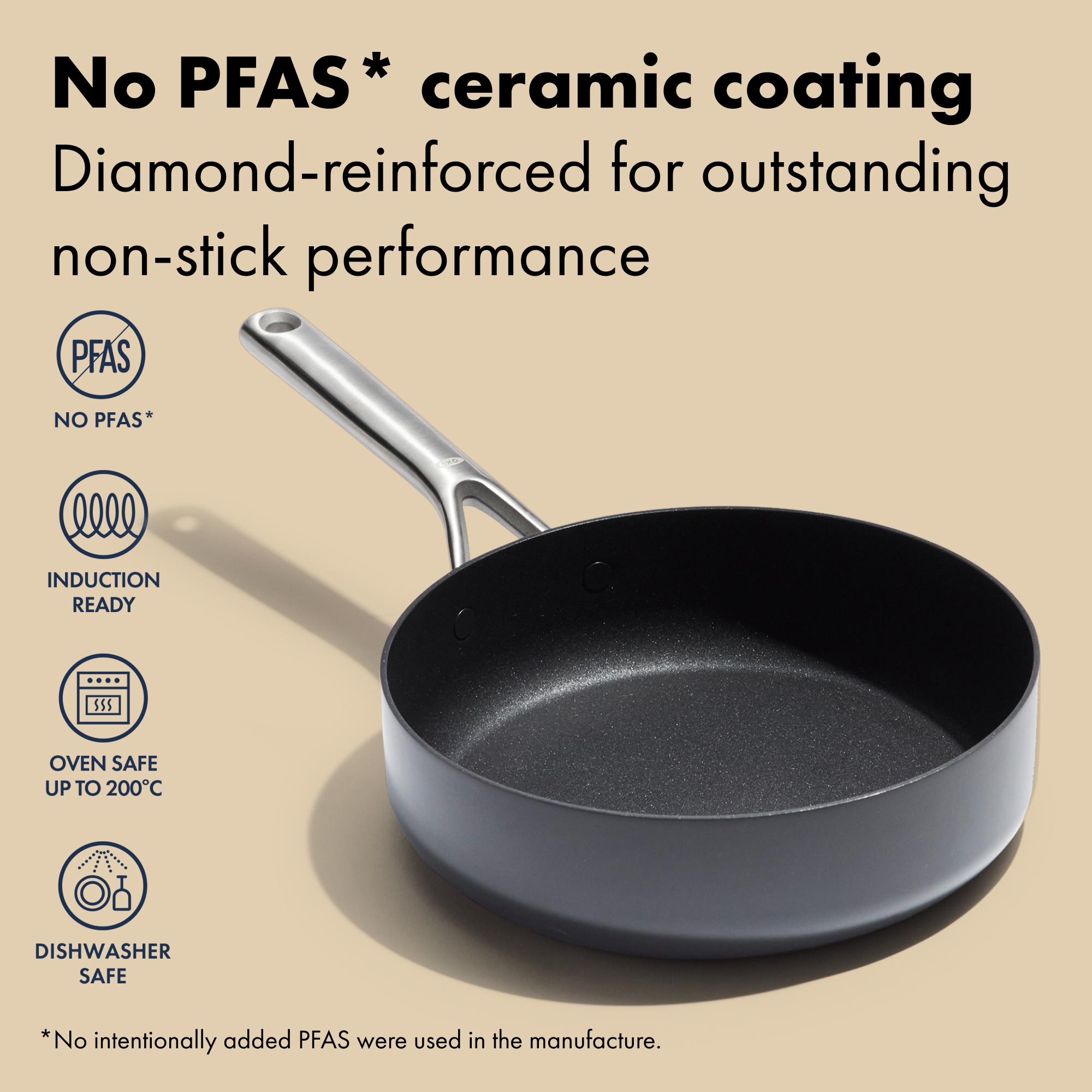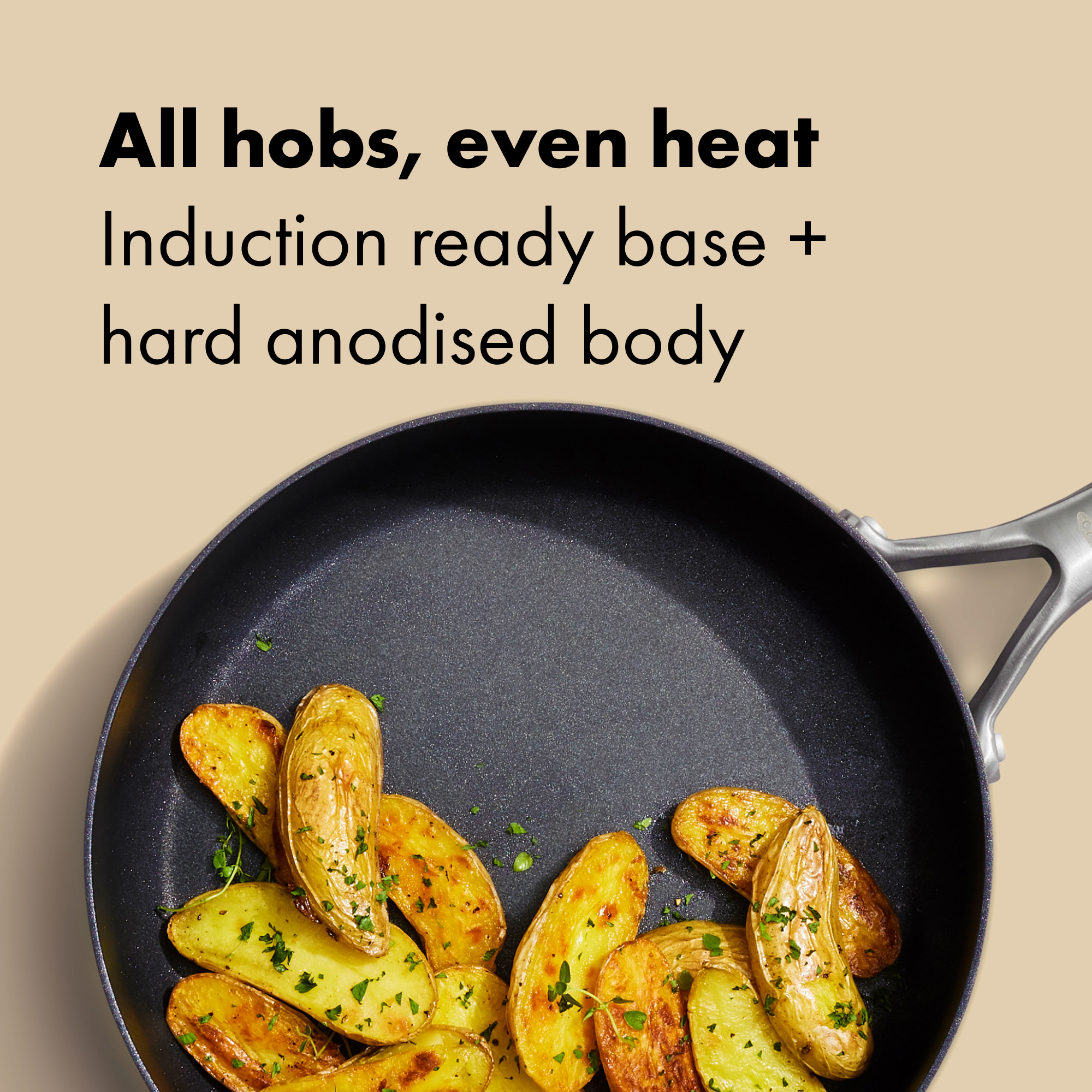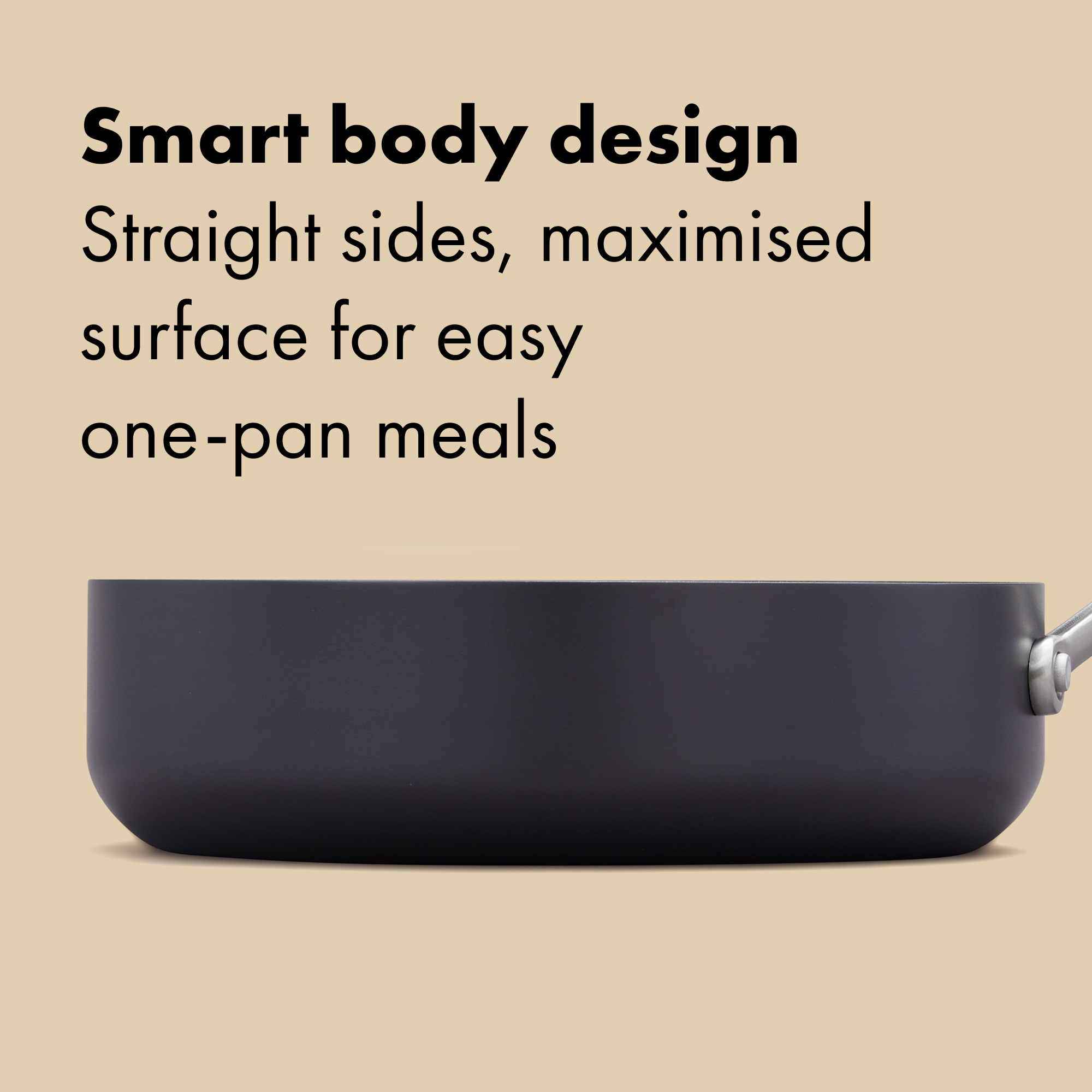 For sauces that build and braises that finish just so, this 24 cm sauté brings capacity and control. The diamond‑reinforced, no‑PFAS* ceramic non‑stick helps food release gracefully; the hard‑anodised body with an induction‑ready base keeps heat steady on any hob. A tempered glass lid lets you monitor without lifting, and the clever knob flips to create an on‑lid utensil rest. Streamlined rivets smooth the interior for fewer food traps and a faster wipe‑down. Oven‑safe to 200°C; dishwasher friendly. Explore the full Ceramic Professional Collection. *No intentionally added PFAS were used in the manufacture.