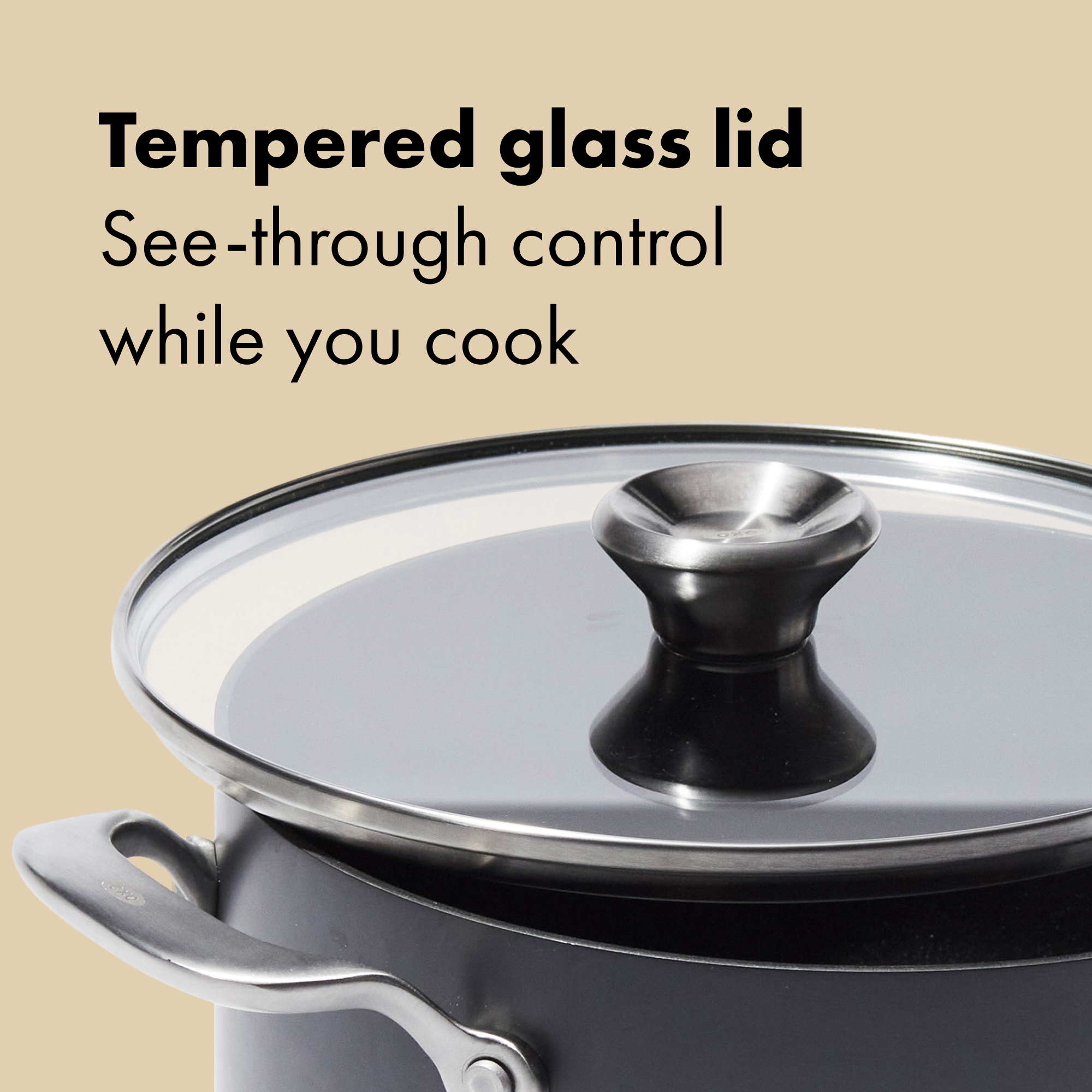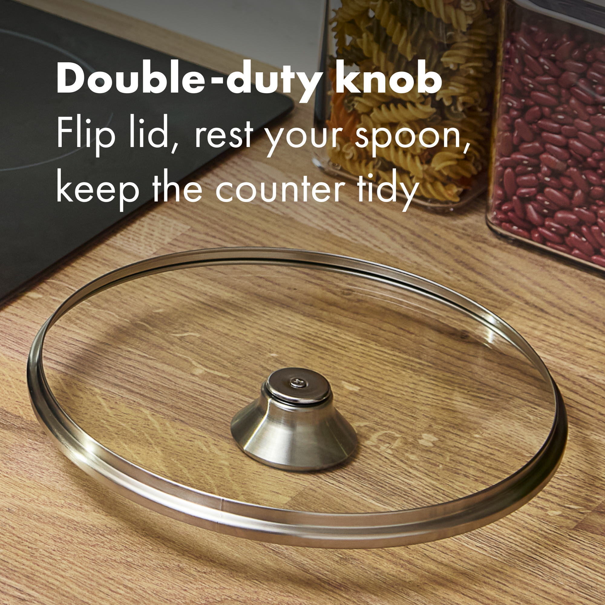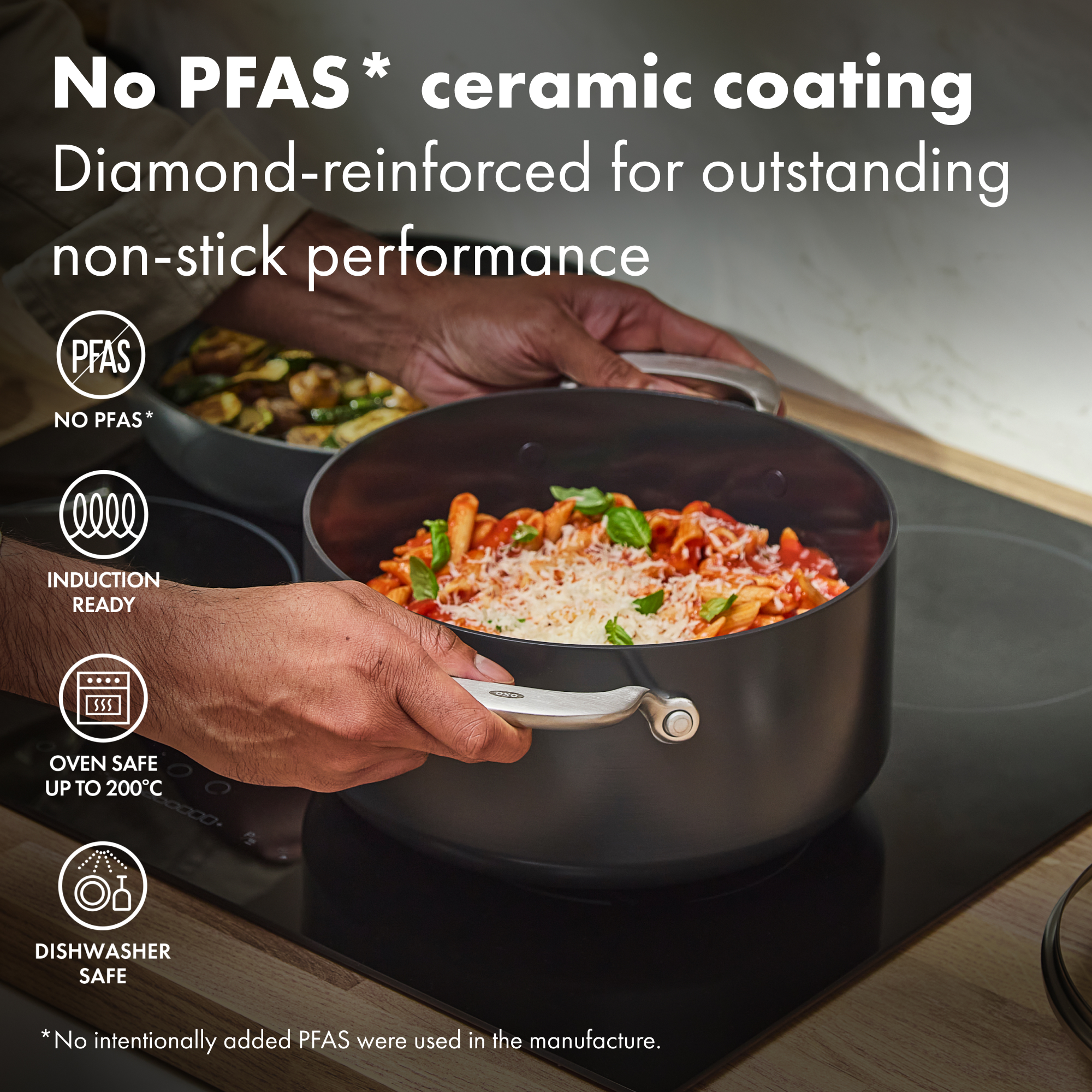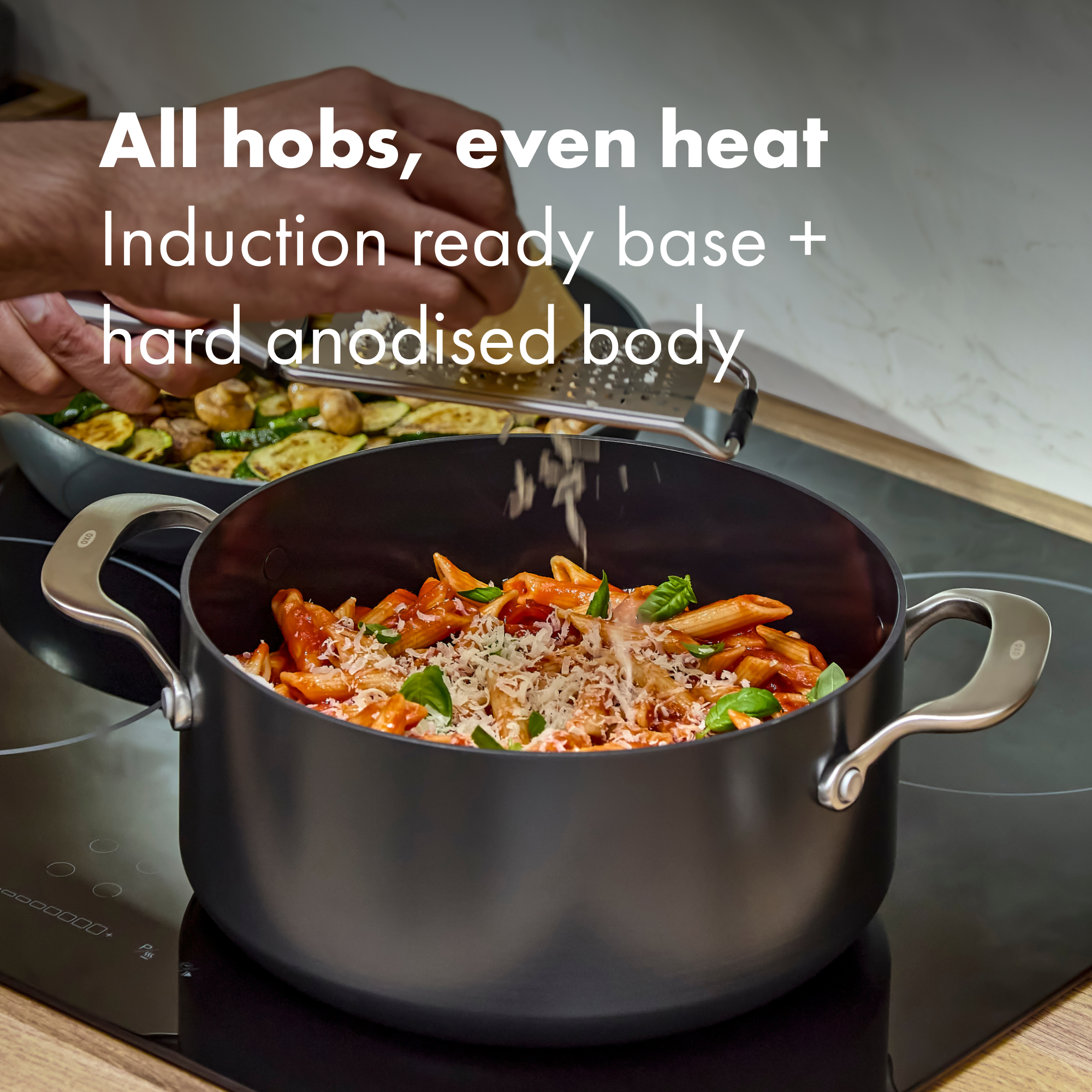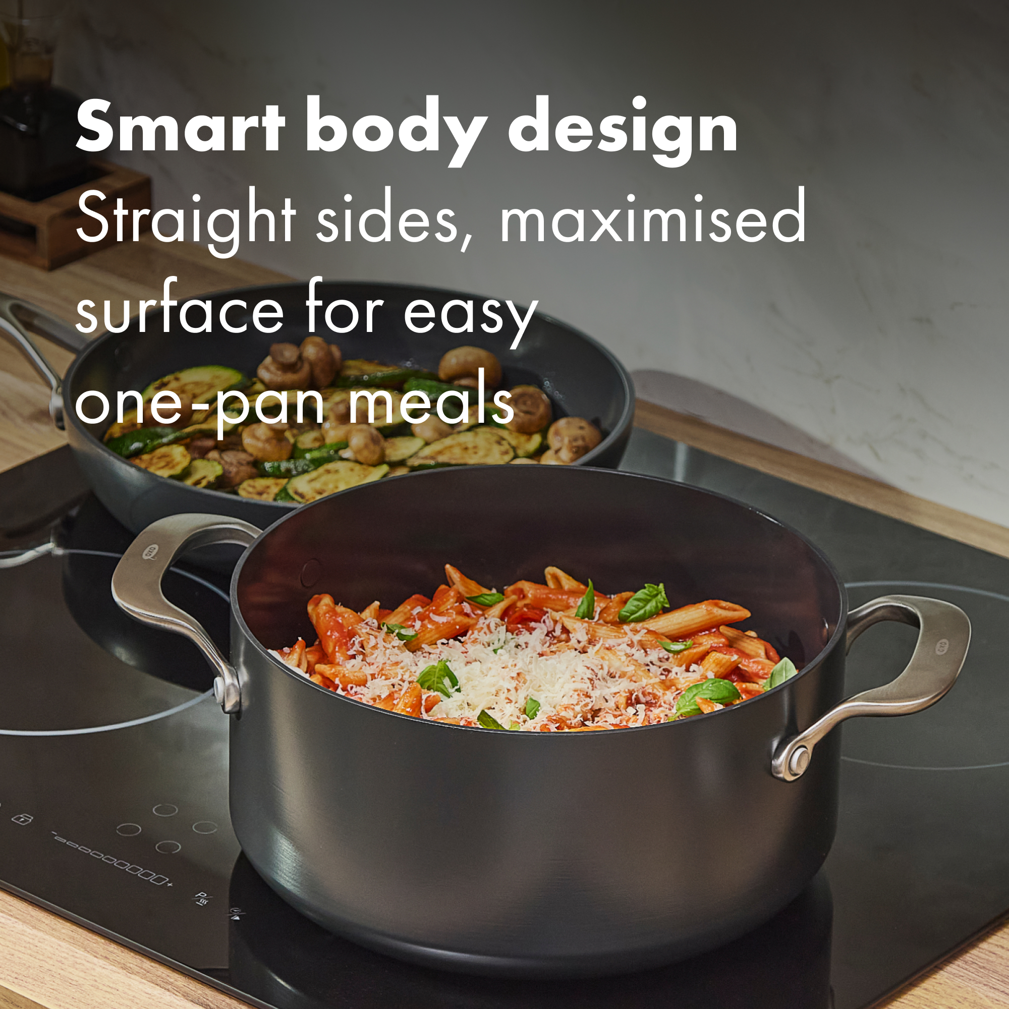 For broths, soups and pasta nights, this 24 cm stockpot keeps heat steady and clean‑up simple. The ceramic non‑stick interior is diamond‑reinforced and no‑PFAS* for smooth release; the hard‑anodised body with an induction‑ready base delivers confident, even heating on any hob. The tempered glass lid preserves heat, the knob flips into a utensil rest, and streamlined rivets reduce food traps. Comfortable stainless steel handles move from hob to oven (up to 200°C), then to the dishwasher. Explore the full Ceramic Professional Collection. *No intentionally added PFAS were used in the manufacture.