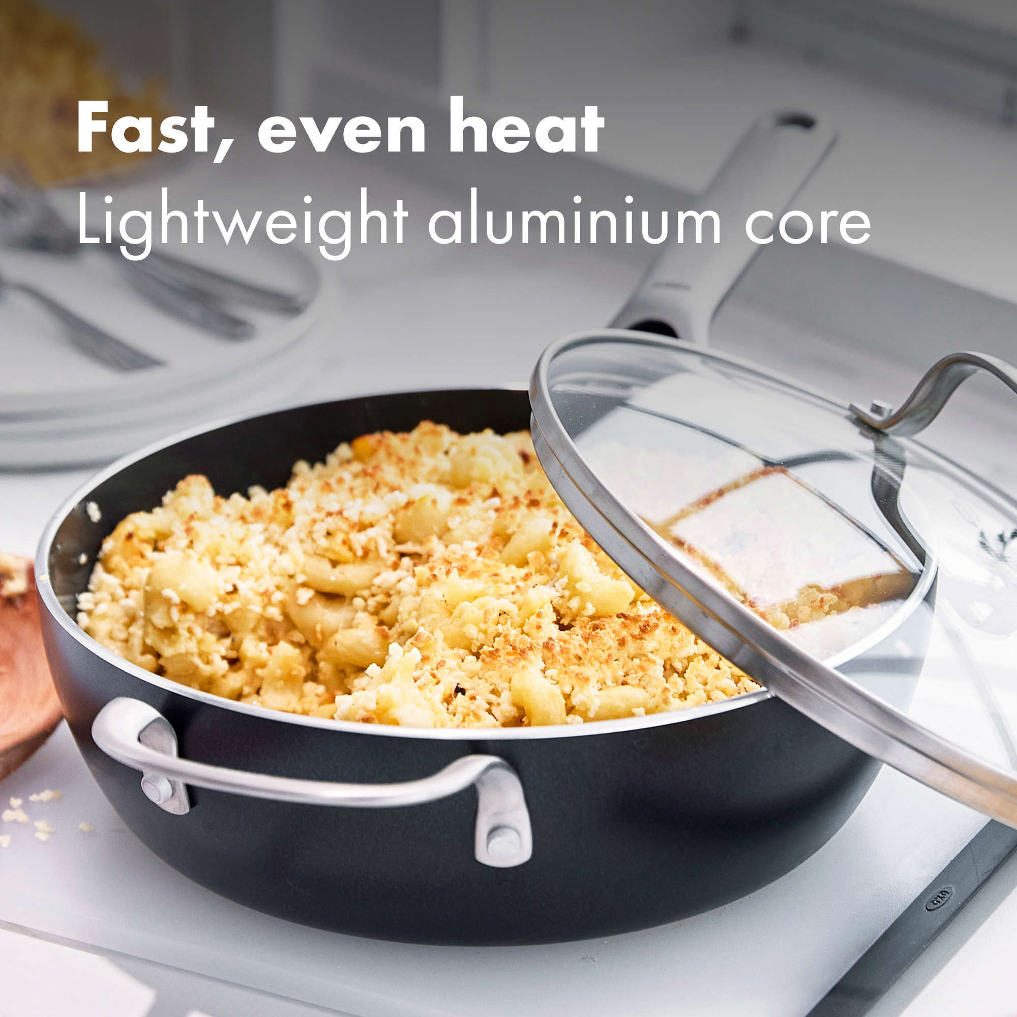 Aluminium body / Diamond‑reinforced ceramic non‑stick surface / Tempered glass lid