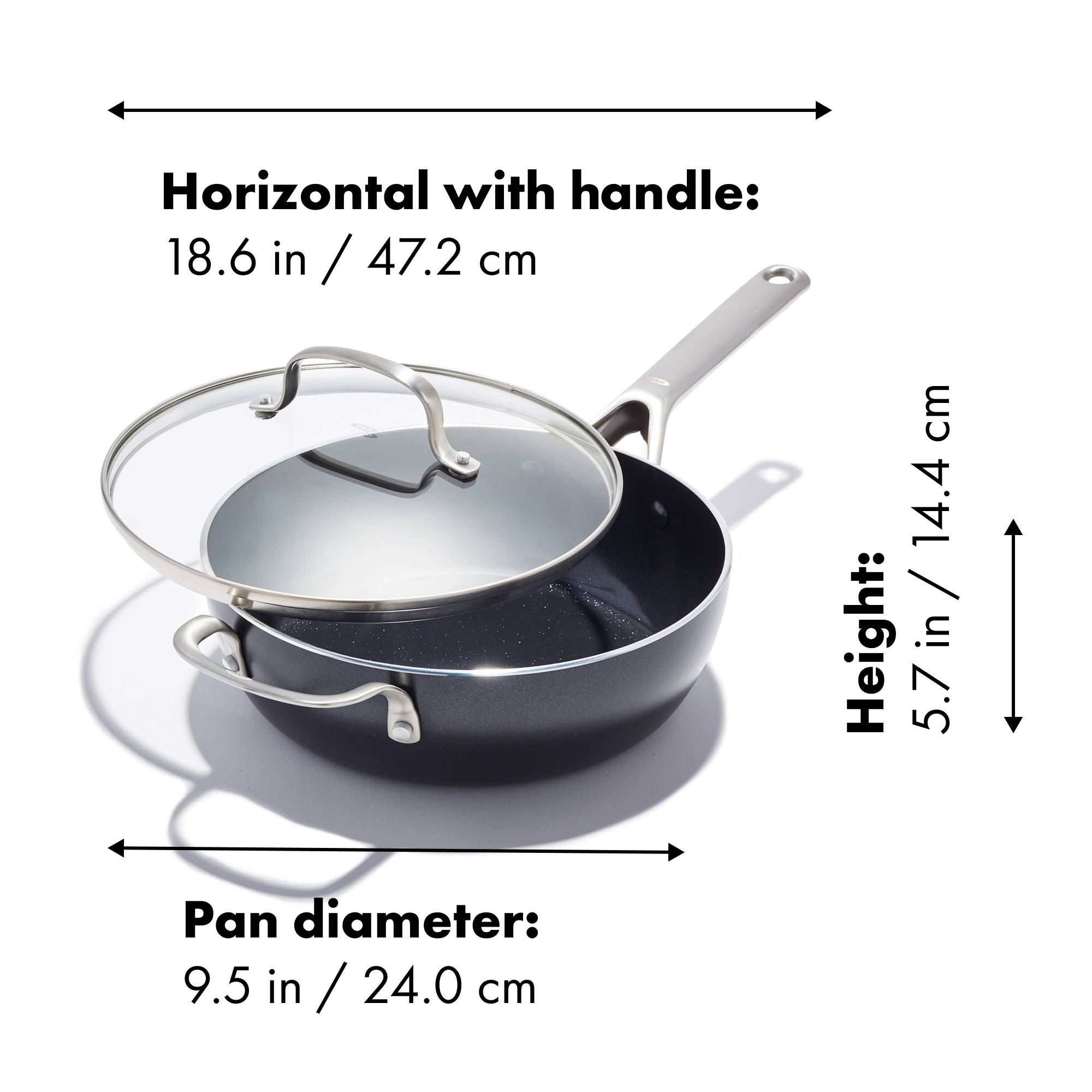 24.0 cm diameter · 47.2 cm length with handle · 14.4 cm height