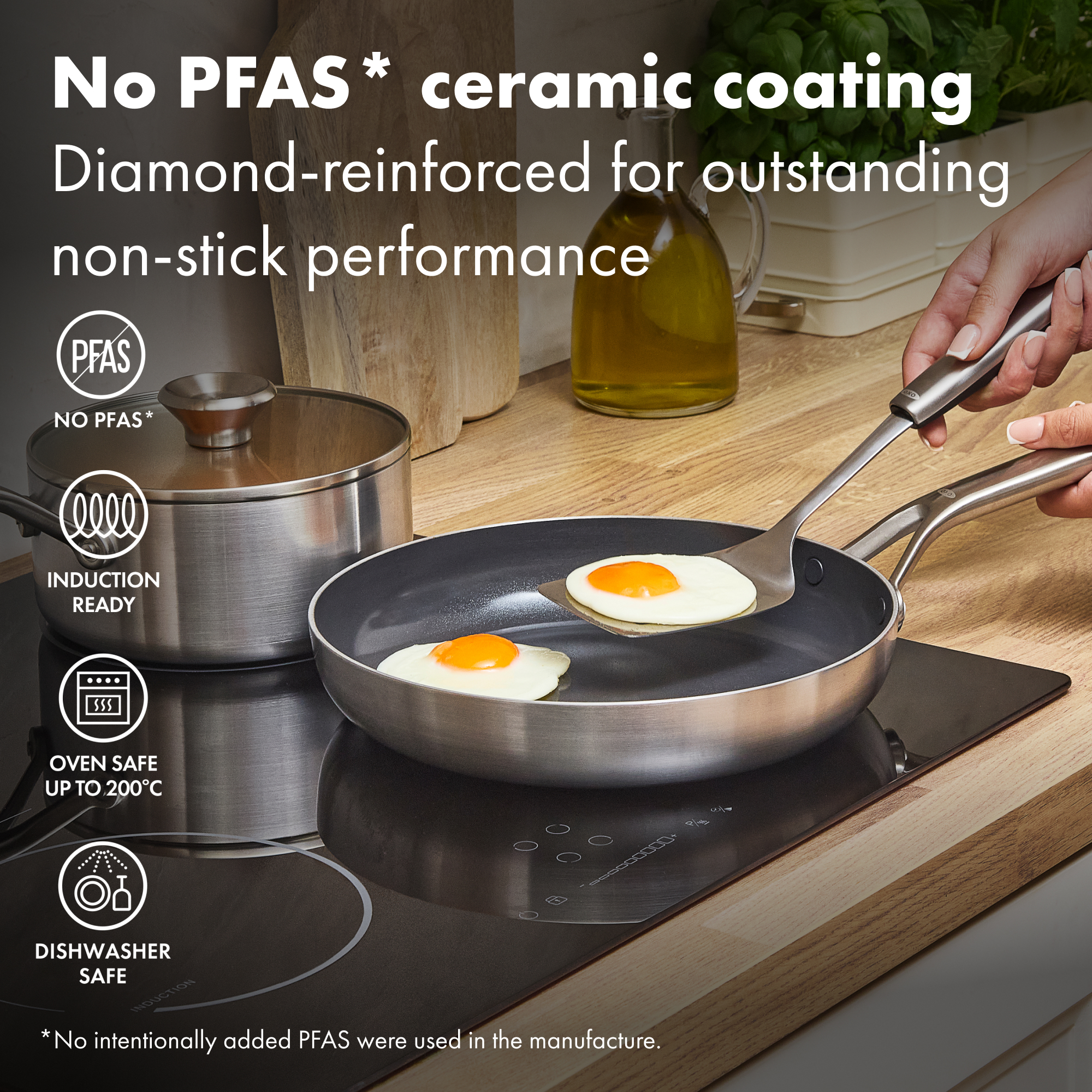 • Ceramic non‑stick, diamond‑reinforced coating: Smooth release for low‑oil cooking and quicker clean‑up—no intentionally added PFAS*