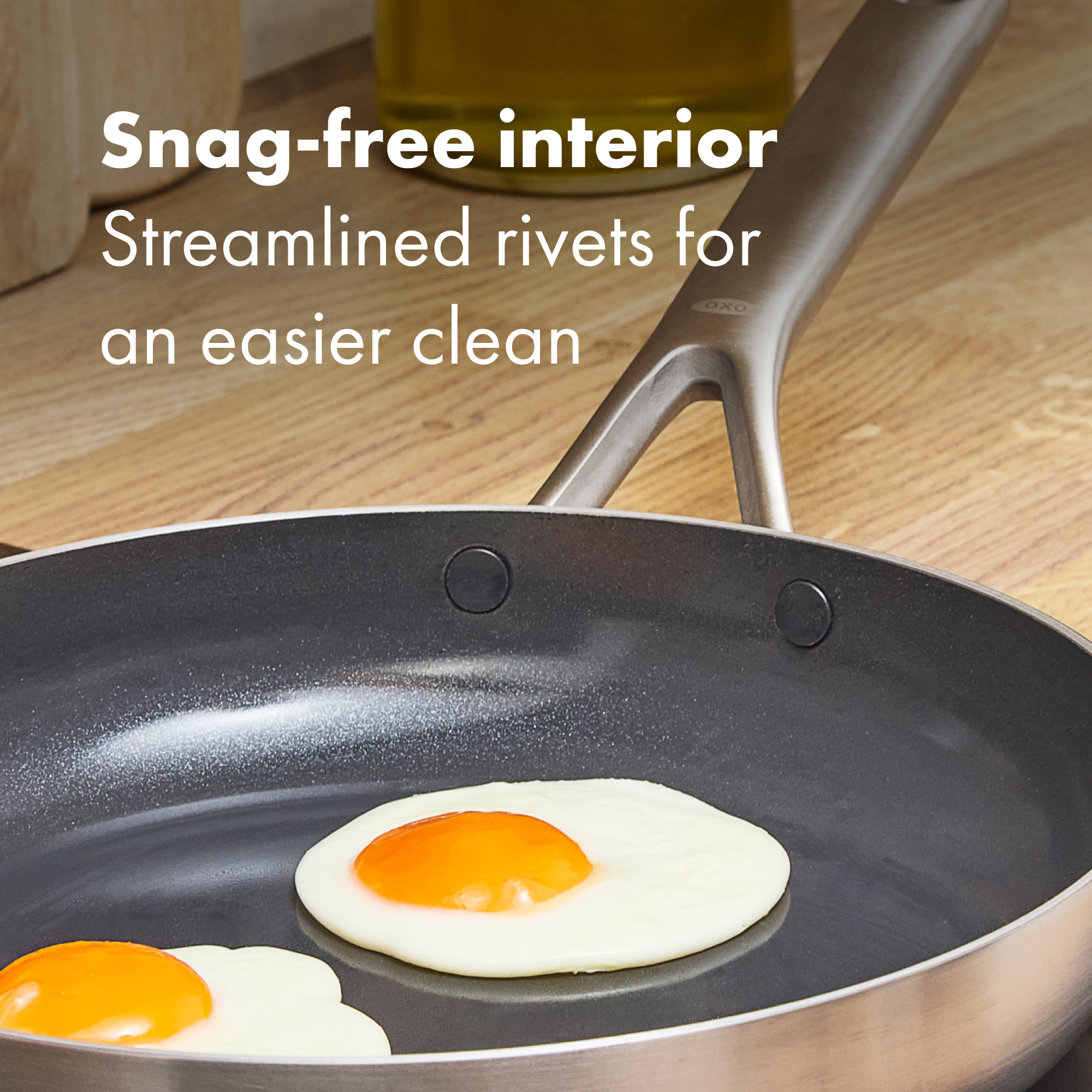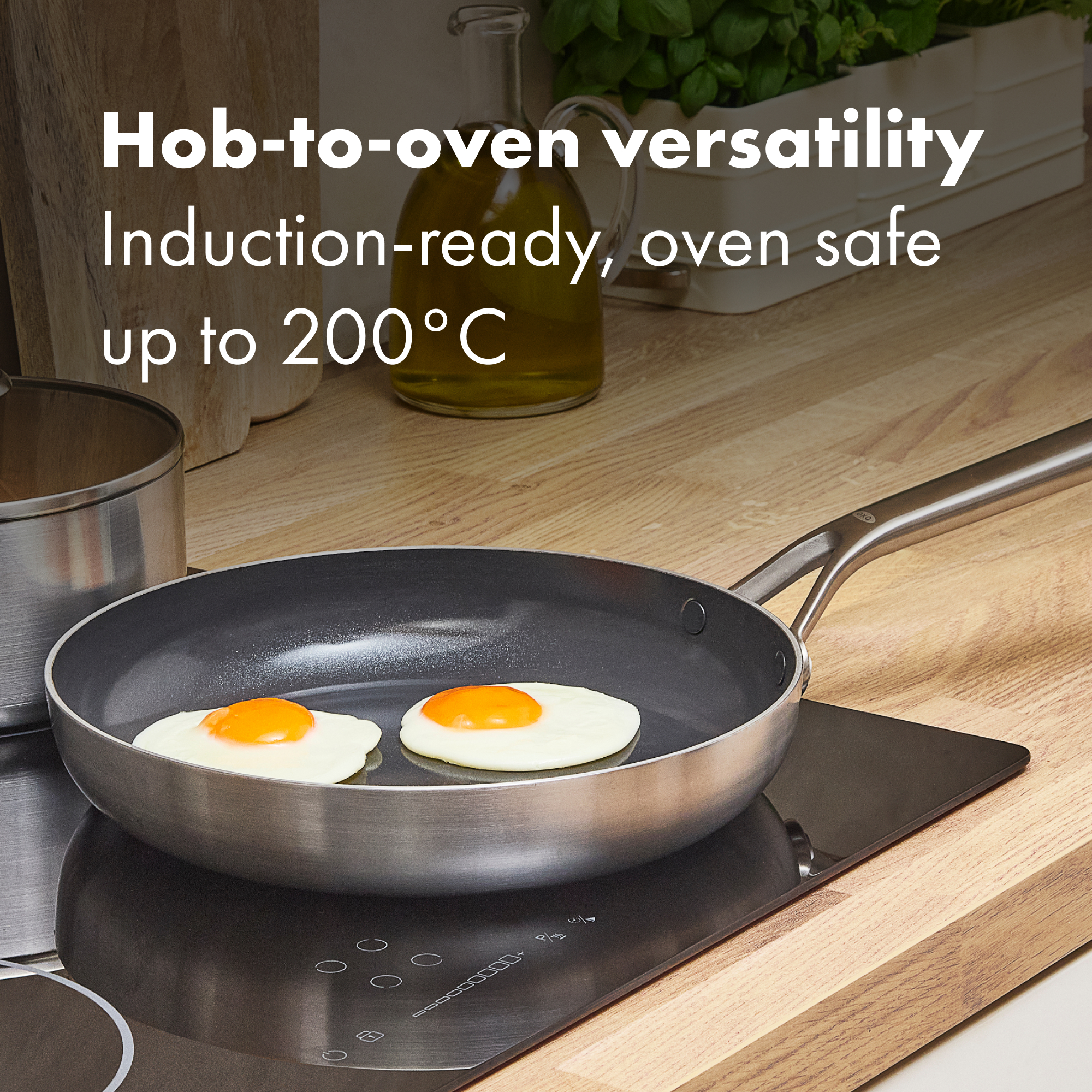 We designed this compact pan for everyday wins—think golden omelettes, fried eggs and sautéed veg without fuss. The tri‑ply body (aluminium core between stainless steel) brings heat up quickly and spreads it evenly, so you get edge‑to‑edge browning on any hob, including induction. Inside, the ceramic non‑stick is diamond‑reinforced to help food slide out cleanly and speed up washing up. Streamlined rivets create a smooth, easy‑wipe interior, and the safeguard rim helps resist chipping. When a finish in the oven makes sense, take it there up to 200°C; when dinner’s done, it’s dishwasher friendly. Light in hand, tidy to clean, and built for busy kitchens.