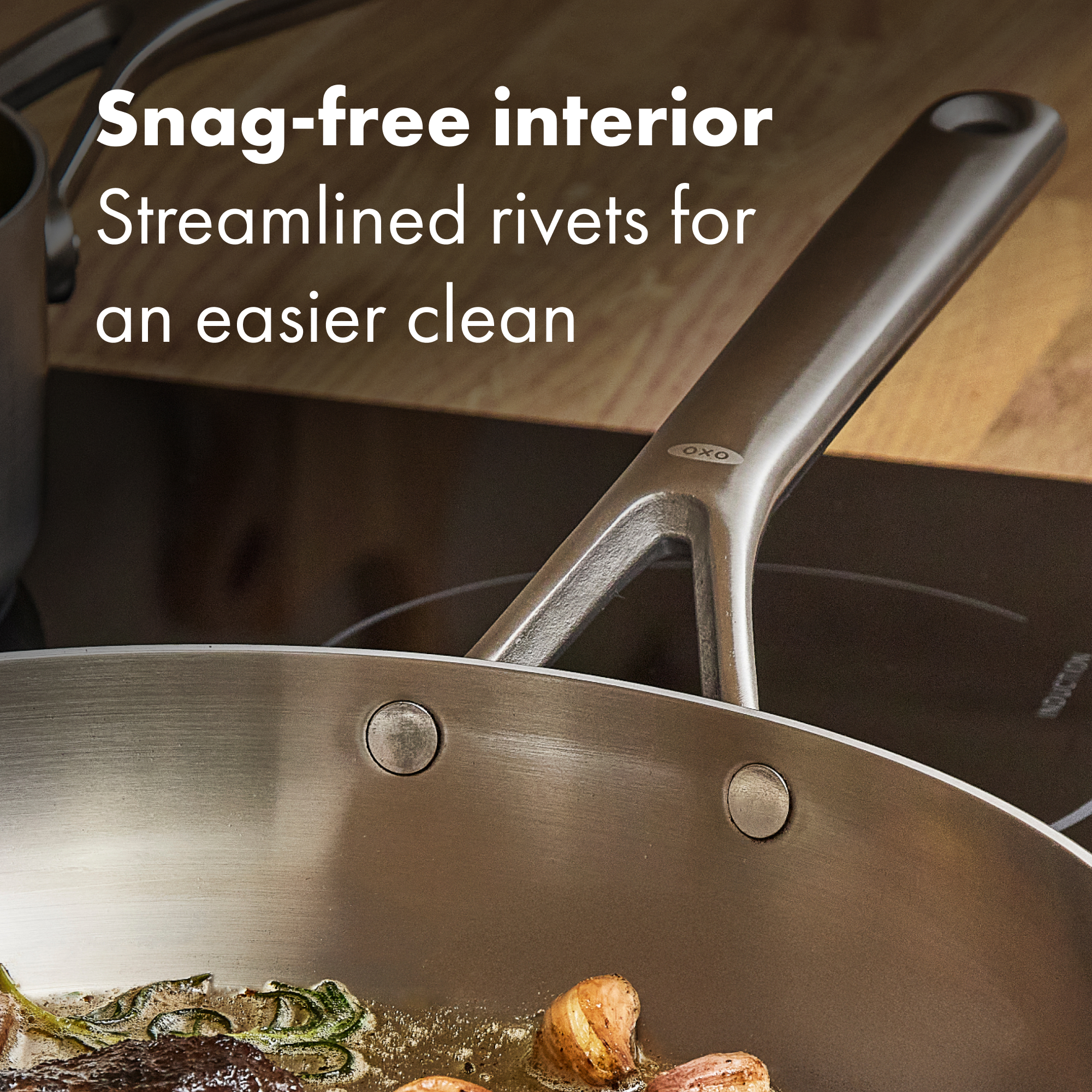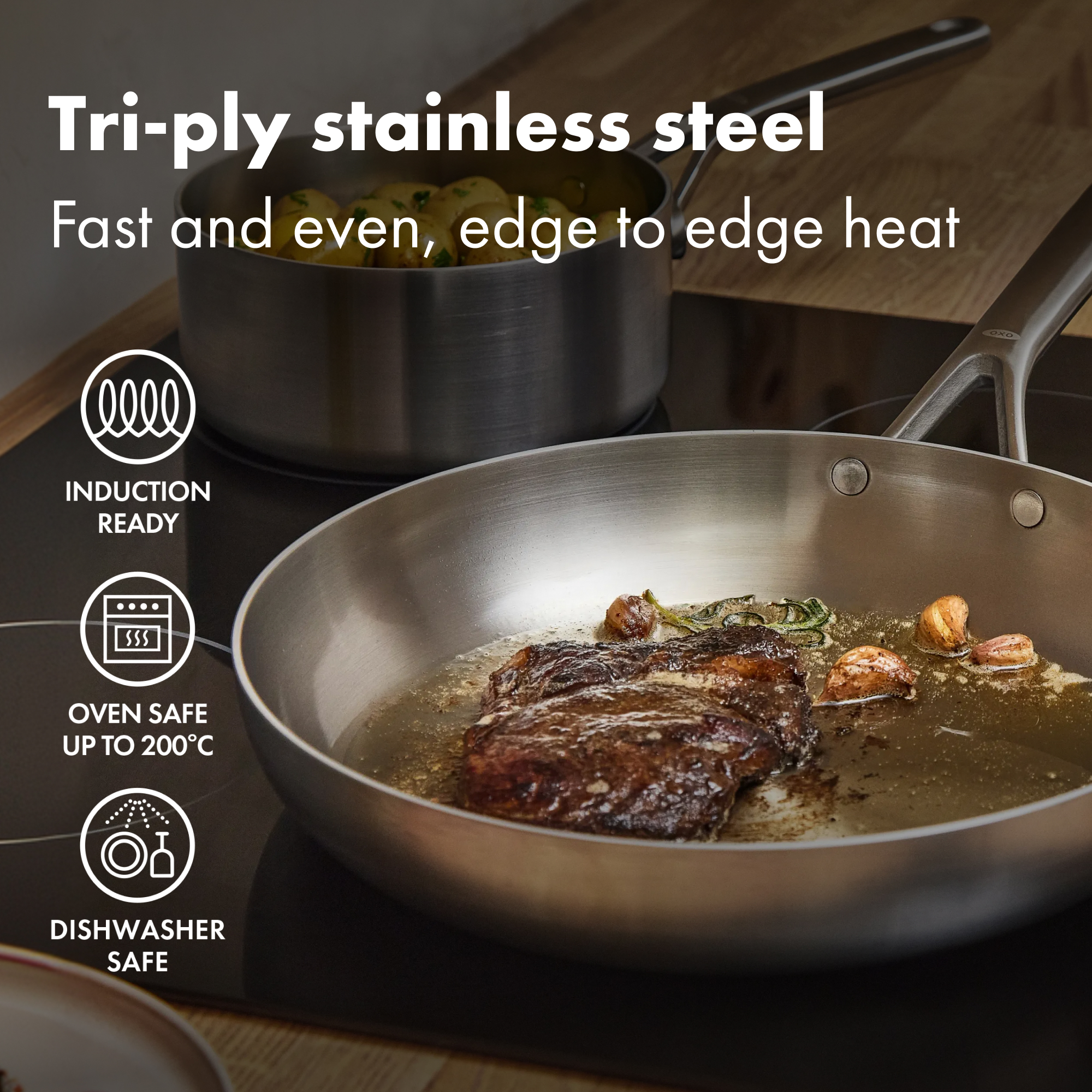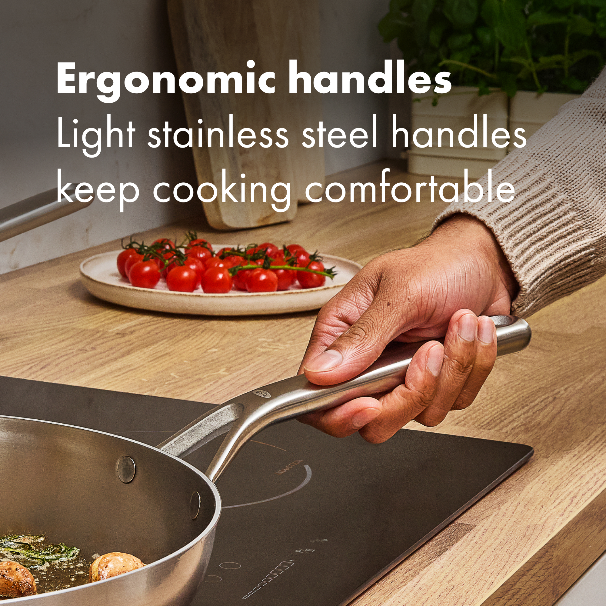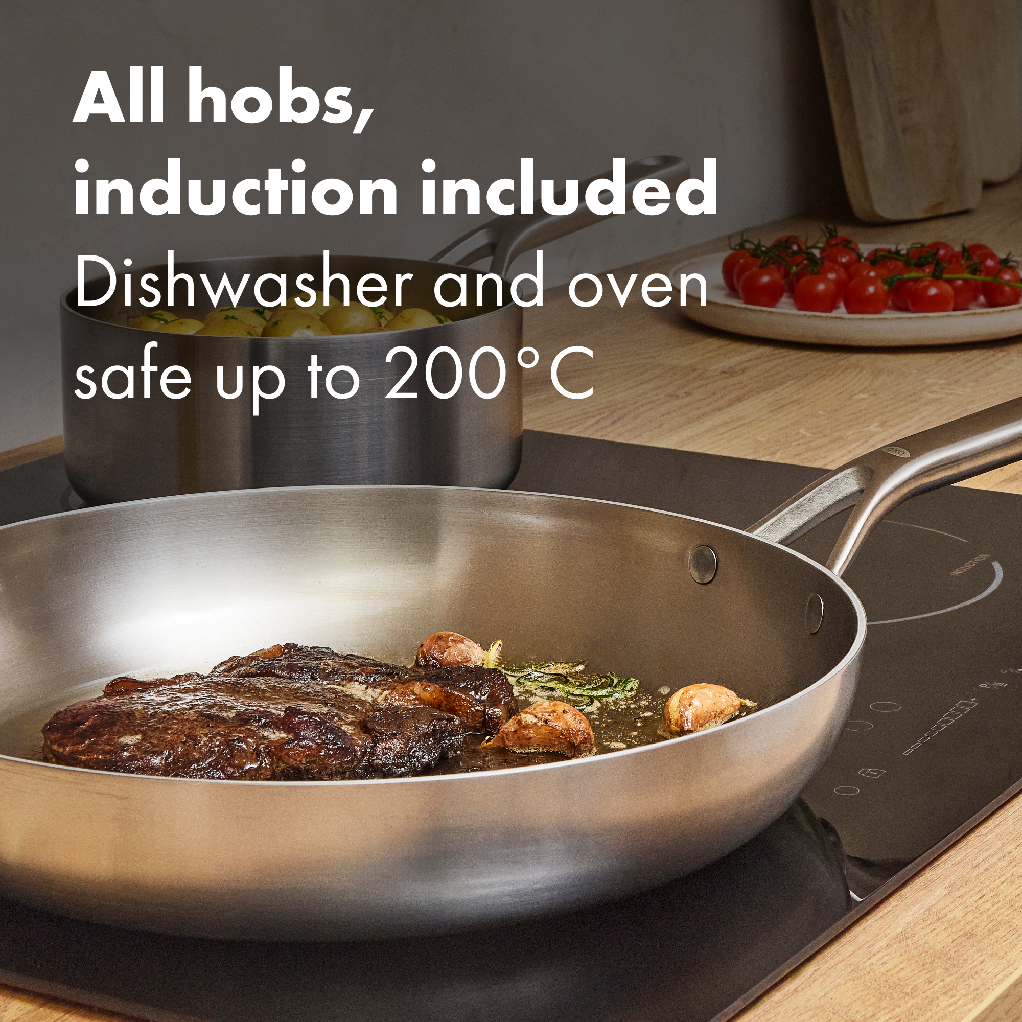 Reach for a stainless steel classic that makes everyday cooking feel simple. Tri‑ply construction reduces hot spots and improves browning, so eggs, veg and small sears cook just the way you want. We kept the interior smooth with streamlined rivets and designed the rim to help resist chipping. Metal utensil safe, this frying pan is happy on any hob (including induction), moves into the oven up to 200°C, and cleans up perfectly in the dishwasher. Need more cookware for your kitchen? Explore the entire Tri-ply Stainless Steel Mira Collection.