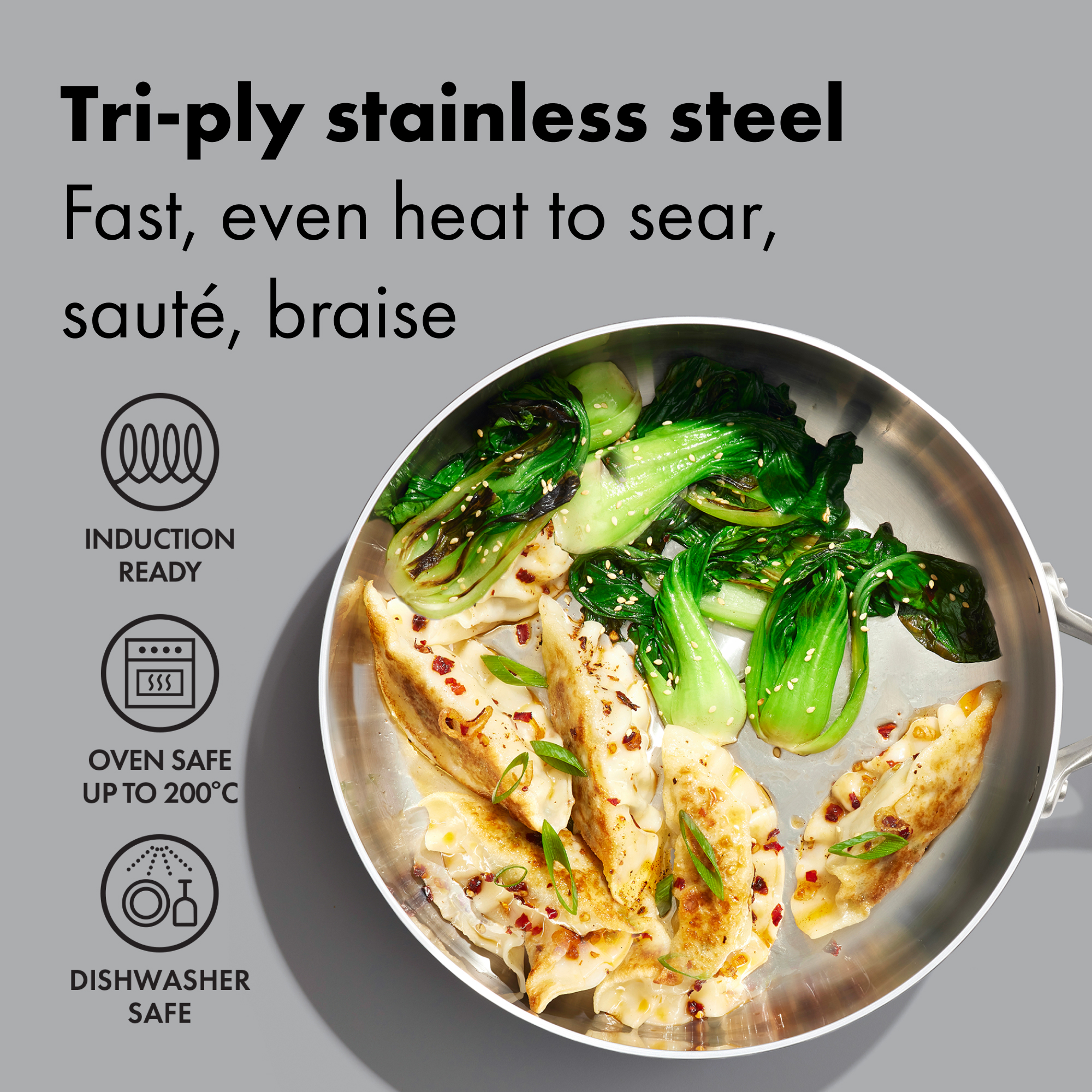 From searing chicken to simmering sauces, this 24 cm sauté pan handles it all. The tri‑ply body spreads heat quickly and evenly across the base and up the walls for consistent results. Peek without losing heat through the tempered glass lid, and rest your spoon on the flipped knob to keep benches cleaner. Interior measurement markings make accuracy simple. The interior is metal‑utensil friendly with streamlined rivets for easier wipe‑downs, and the pan goes from any hob (including induction) to the oven up to 200°C. Dishwasher friendly after service. Need more cookware for your kitchen? Explore the entire Tri-ply Stainless Steel Mira Collection.