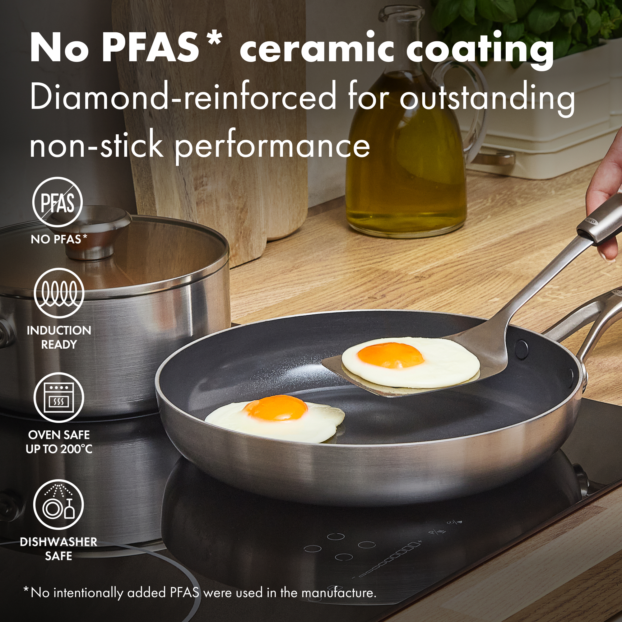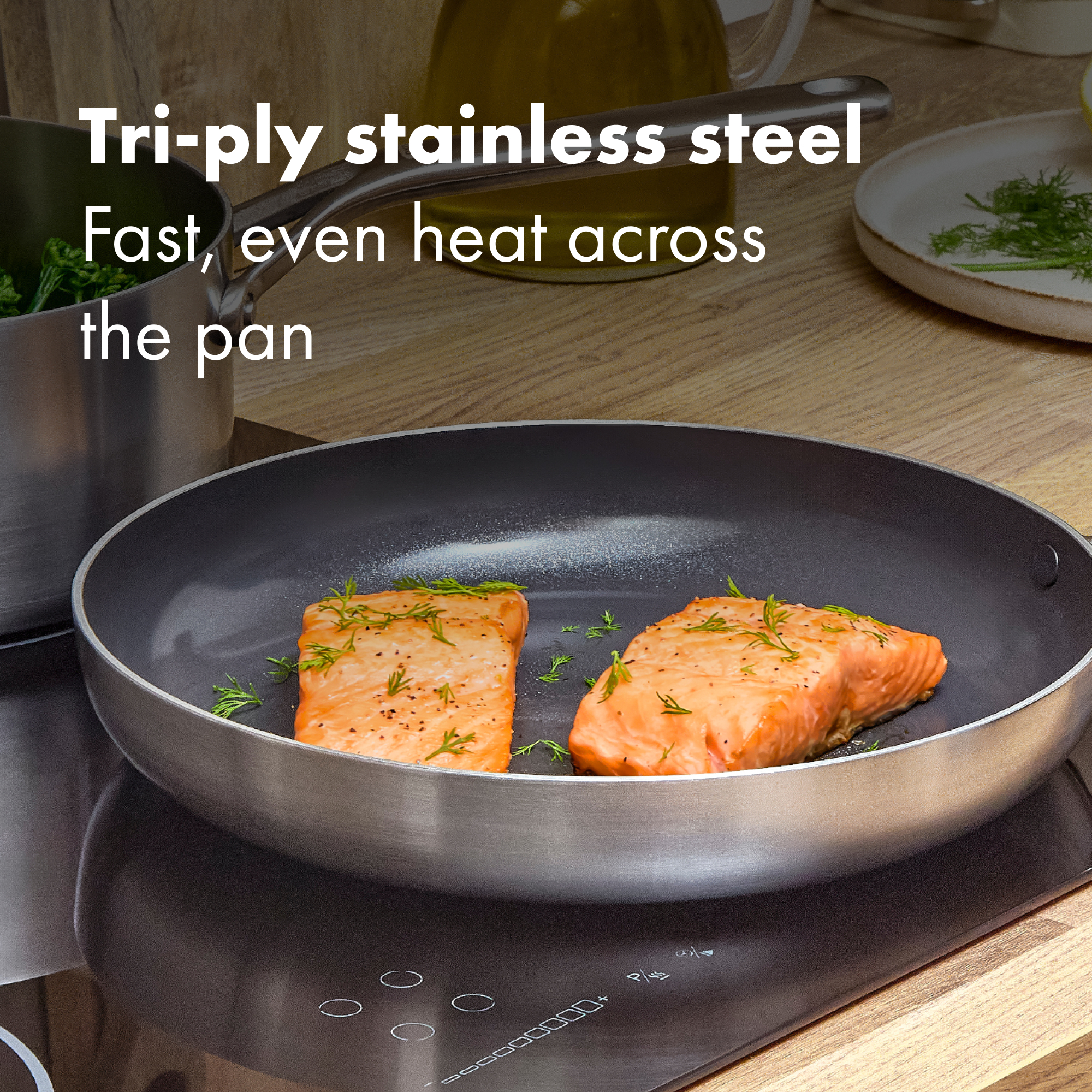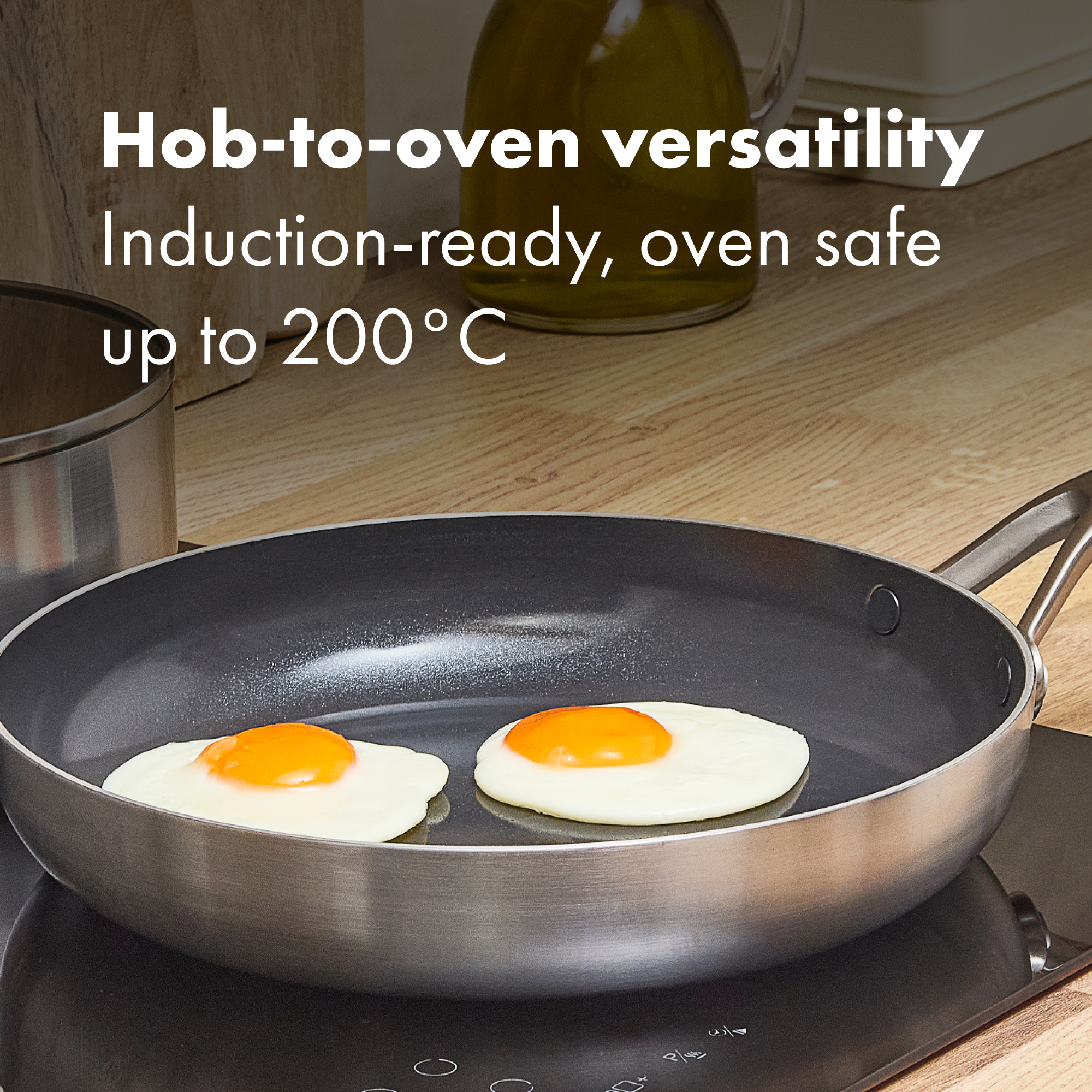Cooking for a crowd? This 30 cm workhorse gives you space to sear without crowding and heat that stays even from centre to edge. The tri‑ply body teams two stainless layers with an aluminium core for fast, uniform results on any hob. Inside, the diamond‑reinforced ceramic non‑stick helps food slide out and clean‑up fly by, while the interior stays smooth thanks to streamlined rivets. The safeguard rim helps resist chipping through busy weeks. Move from hob to oven (up to 200°C) to finish, then pop it in the dishwasher. Need more cookware for your kitchen? Explore the entire Tri-ply Stainless Steel Mira Collection. *No intentionally added PFAS were used in the manufacture.