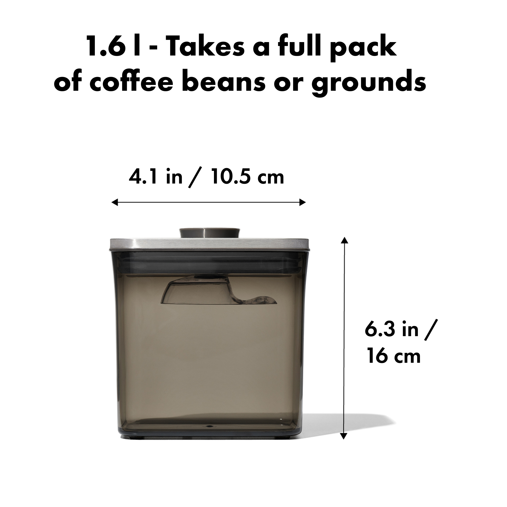 • Sized for everyday coffee: 1.6 L capacity fits a standard 450 g bag of beans or grounds; handy fill line makes decanting easy